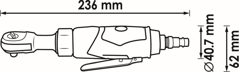 •Für beengte Platzverhältnisse •Umschaltfunktion am Ratschenkopf •Vibrationsarm •Abtrieb: 1/4 Zoll (6,3 mm) Vierkant massiv •Maße: 236 mm •Netto-Gewicht (kg): 0.6 kg •Anzugsmoment maximal [Nm]: 35.2 Nm •Luftbedarf [l/min]: 77 l/min •Kupplungsstecker: Nennweite 7,2 (inklusive) •Luftanschluss Einlass: Innengewinde 12,91 mm (1/4″) •Umdrehungen/Minute (maximal): 240 upm •Rechts-/Linkslauf: einstufig (rechts/links) •Betriebsdruck (bar): 6.3 bar •Handgriff: Kälteisolierender Griff •Schall-Druckpegel: 87.5 dB(A) Lp A •Schall-Leistungspegel: 98.5 db(A) Lp W •Schlauchdurchmesser (empfohlen): 10 mm •Vibrationsbeschleunigung: 3.47 m/s2