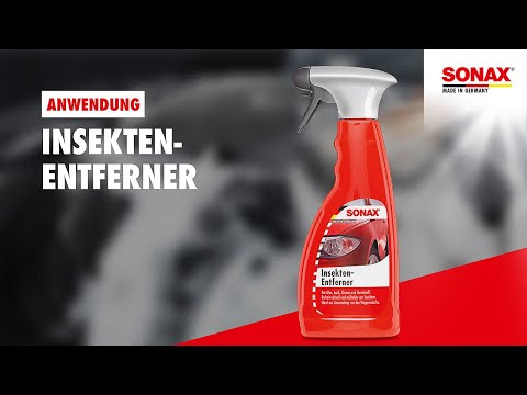 Insektenreste können den Lack schädigen und sollten deshalb immer so schnell wie möglich entfernt werden. Sprayerdüse durch Drehen öffnen. Zu behandelnde Teile gut einsprühen und 3-5 Minuten einwirken lassen. Bei Bedarf die Reinigung mit SONAX InsektenSchwamm Duo (Art.-Nr. 04272000) manuell unterstützen. Anschließend mit Wasser gründlich abspülen oder den Wagen von Hand oder in der Waschanlage waschen. Nicht für Motorräder verwenden.