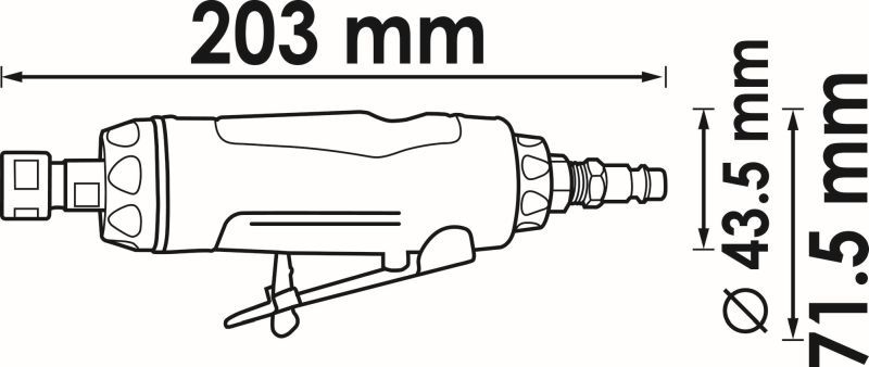 •Fräser, Trennscheiben, Schleifkörper mit 3 und 6 mm Spannfutter •Maße: 203 mm •Netto-Gewicht (kg): 0.54 kg •Luftbedarf [l/min]: 128.2 l/min •Kupplungsstecker: Nennweite 7,2 (inklusive) •Luftanschluss Einlass: Innengewinde 12,91 mm (1/4″) •Umdrehungen/Minute (maximal): 22000 upm •Betriebsdruck (bar): 6.3 bar •Handgriff: Kälteisolierender Griff •Schall-Druckpegel: 97.1 dB(A) Lp A •Schall-Leistungspegel: 86.1 db(A) Lp W •Schlauchdurchmesser (empfohlen): 10 mm •Vibrationsbeschleunigung: 2.90 m/s2